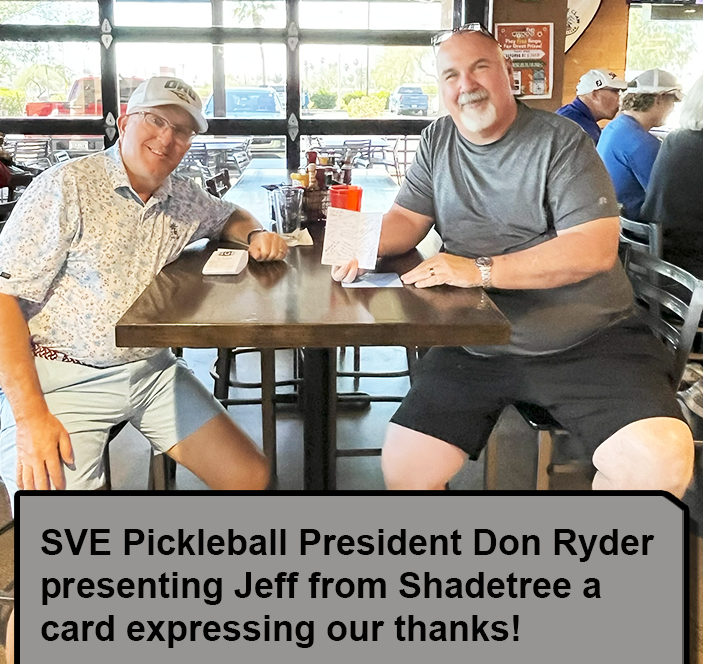 Club meetings are held seasonally Nov-Apr the 2nd Sunday of the month @4:00pm in the Mesa Verde Room. Our courts are located in Sunland Village East (SVE) in Mesa Arizona. The village has 6 pickleball courts and 3 sport courts, all of which are lighted.